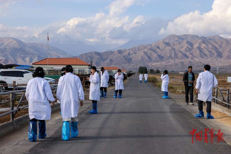 9月10日,新疆博尔塔拉蒙古自治州博乐市,新疆天莱农牧集团股份有限公司养殖场,来访者换上统一服装。为清除病原体,防止牛群患病,从外部进入养殖场的人需先在喷雾消毒室停留30秒,再换上消过毒的白大褂和鞋套。中青报·中青网记者 曲俊燕/摄