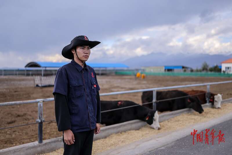 9月10日,新疆博尔塔拉蒙古自治州博乐市,新疆天莱农牧集团股份有限公司养殖场,20岁的撇依力·叶尔加义在牛栏前。他是伊犁州新源县人,在伊犁职业技术学院畜牧兽医专业就读,明年即将毕业。通过校企合作政策,加上自身的专业兴趣,他来到该公司实习,每天清晨为犊牛测量体温、准备牛奶、进行预防性护理,这些看似简单的工作却需要专业的知识和细致的操作。他认为这里的工作环境很适合自己,未来打算留下。中青报·中青网记者 曲俊燕/摄