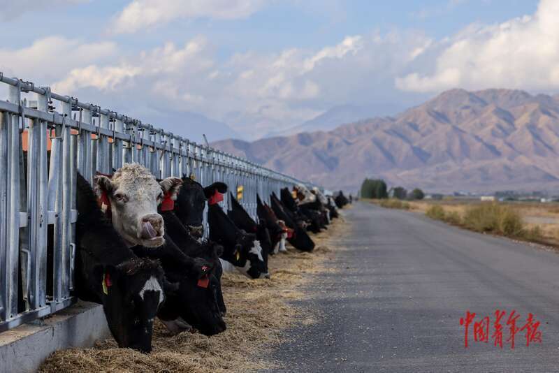 9月10日,新疆博尔塔拉蒙古自治州博乐市,新疆天莱农牧集团股份有限公司养殖场上的牛群。该公司养殖场安装了恒温水系统,并有3万亩有机饲草料种植基地,这里的牛一年四季喝的都是温水,吃的是有机饲料。中青报·中青网记者 曲俊燕/摄